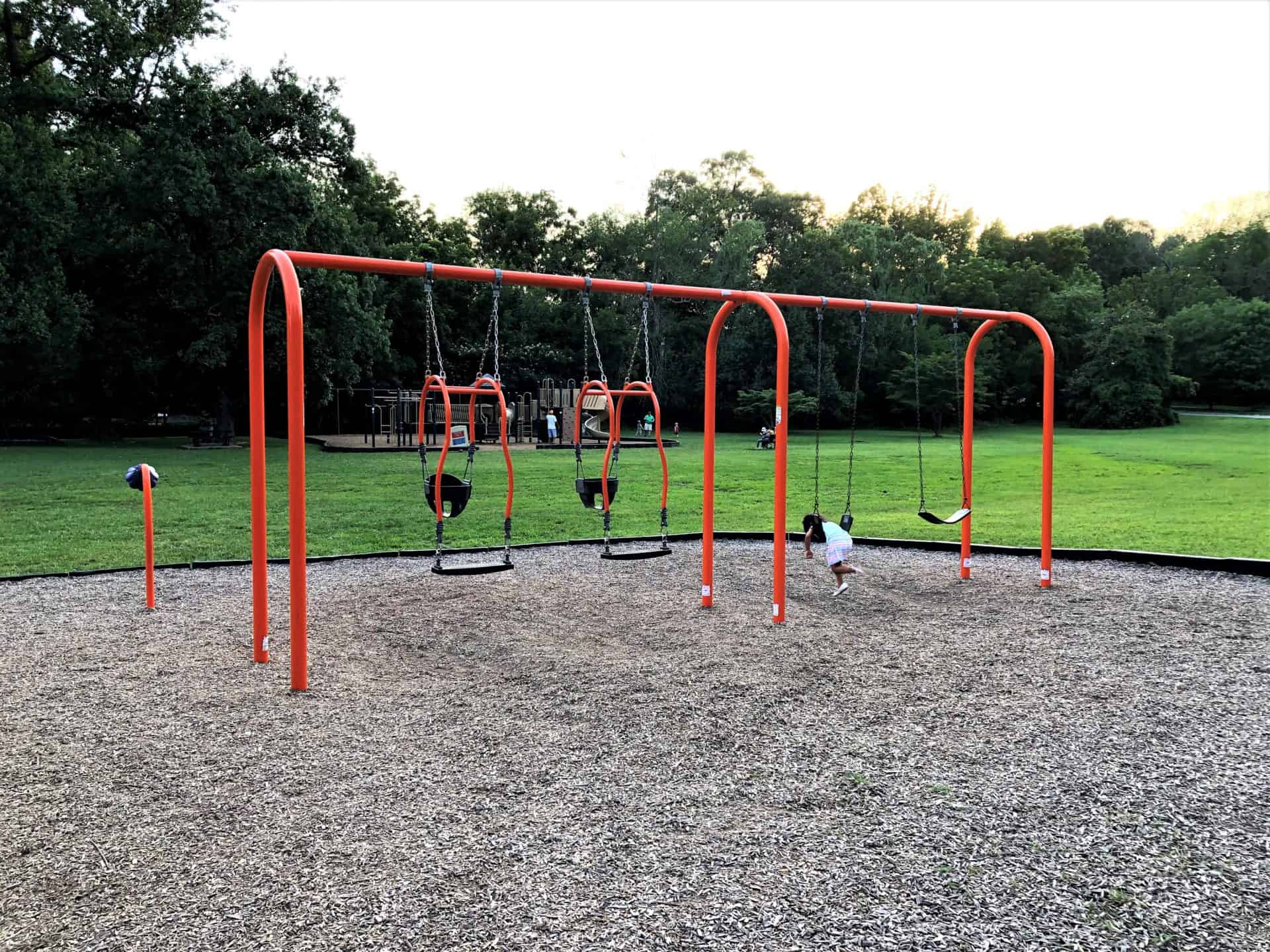 This park has 107 acres, two playgrounds, fields, and a large wooded area. The playground includes plenty of inclusive playground equipment such as zero-gravity swings, a sensory climbing dome, and a merry-go-all to provide play opportunities for kids of all abilities. Under the playground is an open-grid tile path that is designed to make it easier for wheelchairs and strollers to get into the play area and access the features.